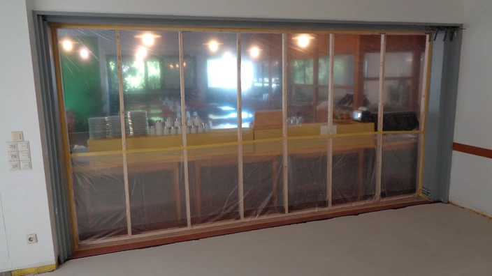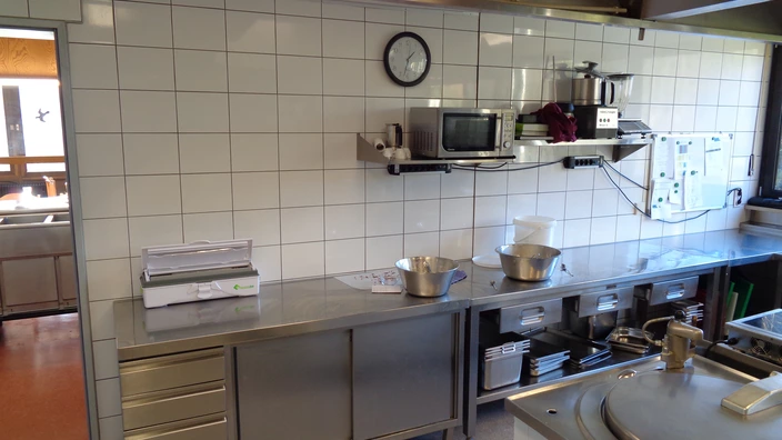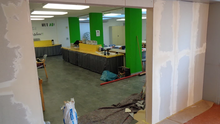 Die Arbeiten gehen zügig voran und es konnten bereits viele wichtige Schritte erledigt werden: Neben der Erneuerung des kompletten Küchenbodens wurde etwa der bisher eingesetzte, in die Jahre gekommene Herd entfernt und durch einen Arbeitstisch mit drei modernen Induktionsplatten ersetzt. In der Salat-küche wurden die Fliesen erneuert und die Wände gestrichen, zudem gibt es dort nun auch fließend warmes Wasser. Der Speiseaufzug, der für einen raschen Transport frisch zubereiteter Speisen sorgen soll, konnte seit geraumer Zeit nicht mehr verwendet werden und wurde nun wieder instand gesetzt und in Betrieb genommen. Außerdem wurden die beiden stark ver-rosteten Heizkörper entsorgt und ein neuer Heizkörper installiert. Alte Holz-schränke im Bereich der Speisenausgabe wurden demontiert, die Wände neu verfliest und anschließend neue Edelstahlschränke installiert. Auch die Innen-wand zur Essensausgabe auf der Seite der Küche einschließlich der dortigen Türe wurde erneuert. Wo nötig, wurden neue Silikonfugen angebracht. Zu den durchgeführten Maßnahmen gehört darüber hinaus auch die Einführung eines kontinuierlichen Schädlingsmonitorings. Derzeit noch eingebaut wird eine Trennwand zwischen zwei Bereichen des Speisesaals.