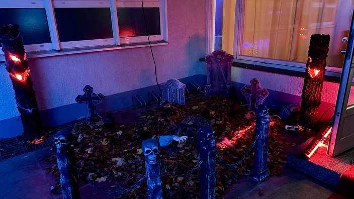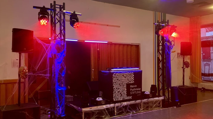 Dank der großartigen Unterstützung der Firmen b-log GmbH, EFAG GmbH & Co. KG, Global Truss GmbH, GLP German Light Products GmbH, Maiwald Eventtechnik und MEEVI-rent GmbH verwandelte sich das leerstehende Gebäude in einen stimmungsvollen Friedhof voller Nebel, Licht und Musik. Schon beim Betreten begrüßte ein riesiges, leuchtendes Plakat die Gäste – ein echter Hingucker, der auch zahlreiche neugierige Nachbarn und Familien anlockte. Drinnen sorgten bewegte Scheinwerfer, dichter Nebel und DJ Felix für das perfekte Halloweenfeeling. Zwischen Monstern, Geistern und anderen schaurigen Gestalten wurde von 16 bis 22 Uhr ausgelassen getanzt, gestaunt und gelacht.